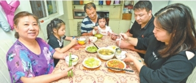 在市民李娜(右一)家,不仅饭菜分量适中,还使用公勺和公筷盛汤夹菜。