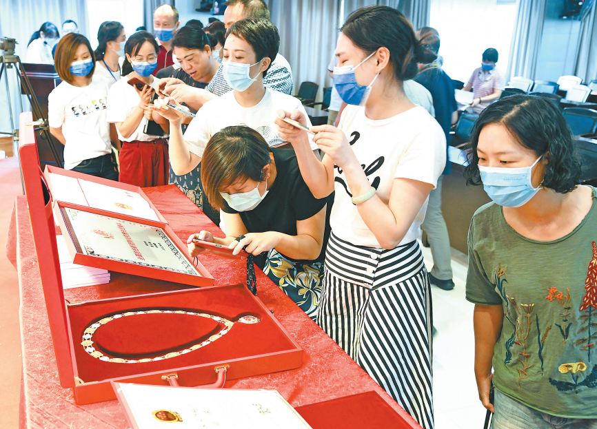 9月9日上午,武汉市金银潭医院的会议室主席台上摆放着四样物品:印有张定宇名字的“人民英雄”国家荣誉证书、“人民英雄”奖章、全国抗击新冠肺炎疫情先进集体牌匾、全国抗击新冠肺炎疫情先进集体证书。该院医务人员纷纷围拢上来观看、拍照,体验作为医务工作者的自豪感和荣誉感,激励自己在未来的工作中继续奋勇前进。记者金振强 摄