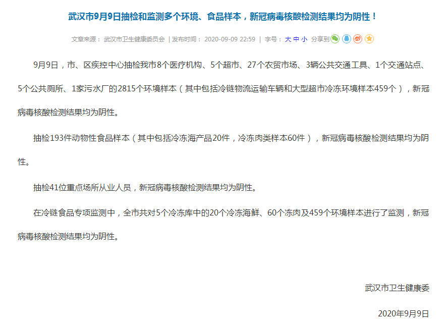 9月9日,市、区疾控中心抽检我市8个医疗机构、5个超市、27个农贸市场、3辆公共交通工具、1个交通站点、5个公共厕所、1家污水厂的2815个环境样本(其中包括冷链物流运输车辆和大型超市冷冻环境样本459个),新冠病毒核酸检测结果均为阴性。