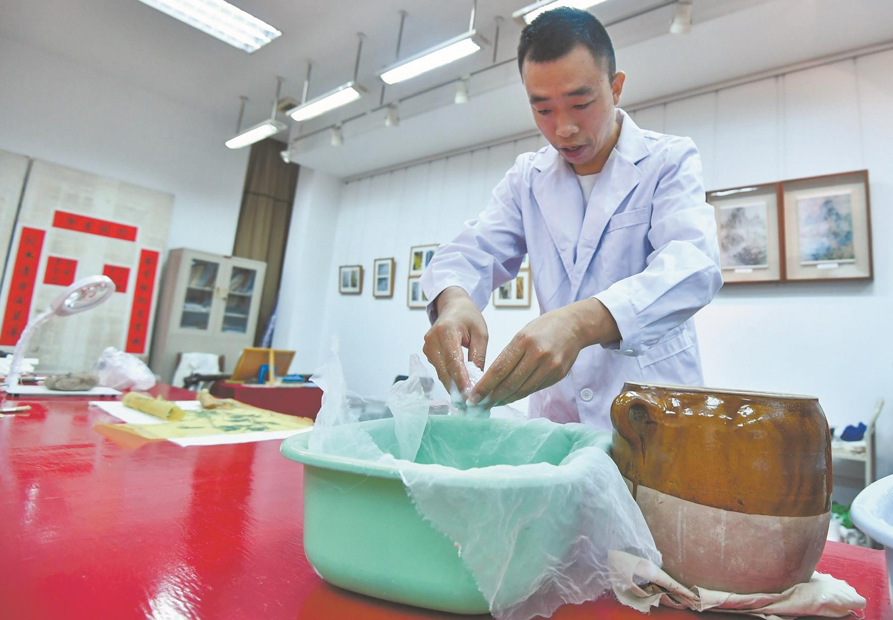 童年时受家人熏陶,少年时师从中国工艺美术大师王士杰学习书画装裱,青年时以非遗传承人身份,入天津、北京学习古画修复。如今,42岁的李广来已是书画协会及书画名家座上宾,举办了省级个人装裱艺术展,在中南民族大学传艺授课。但谈及古籍字画修复,他口中却是一个“难”字。