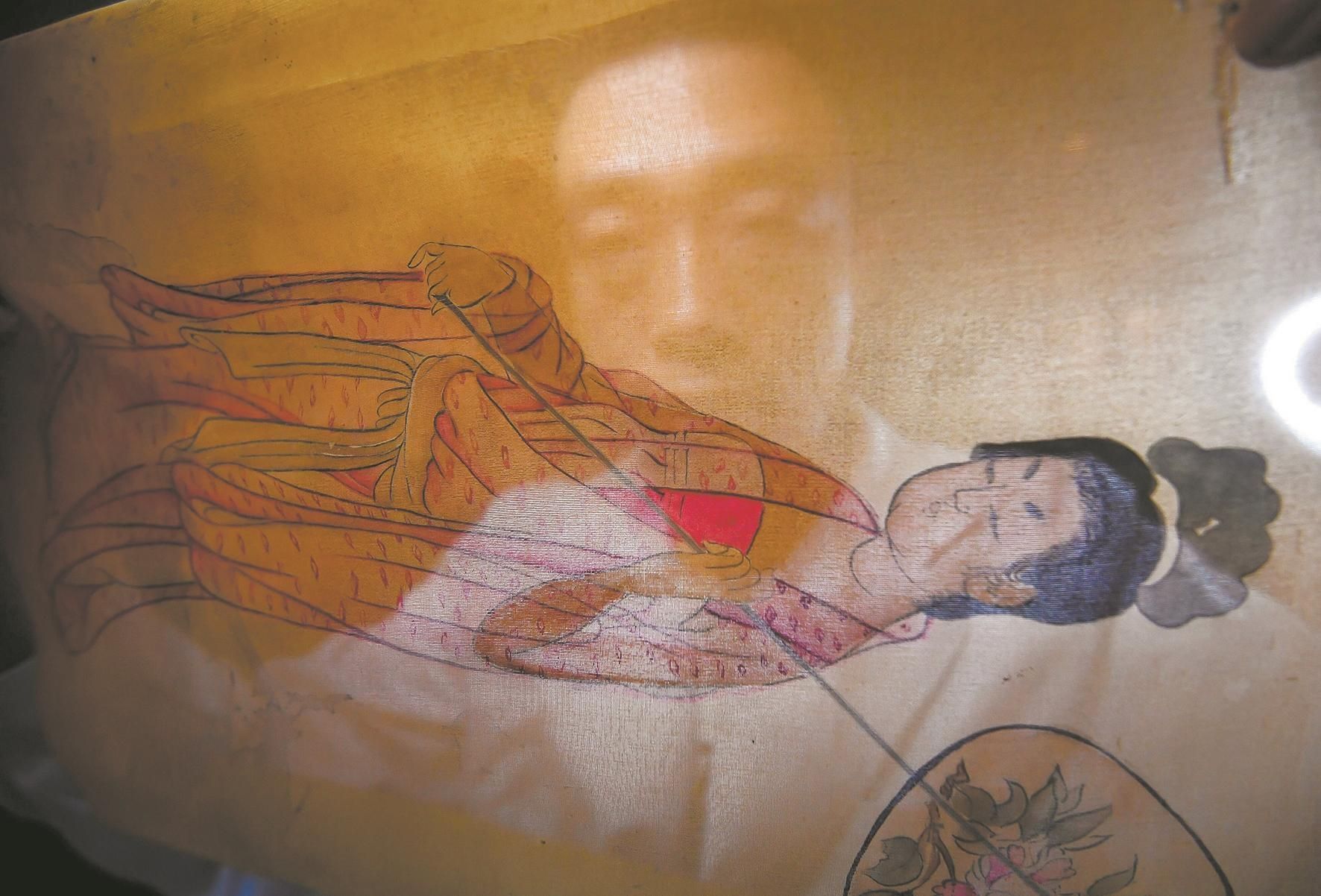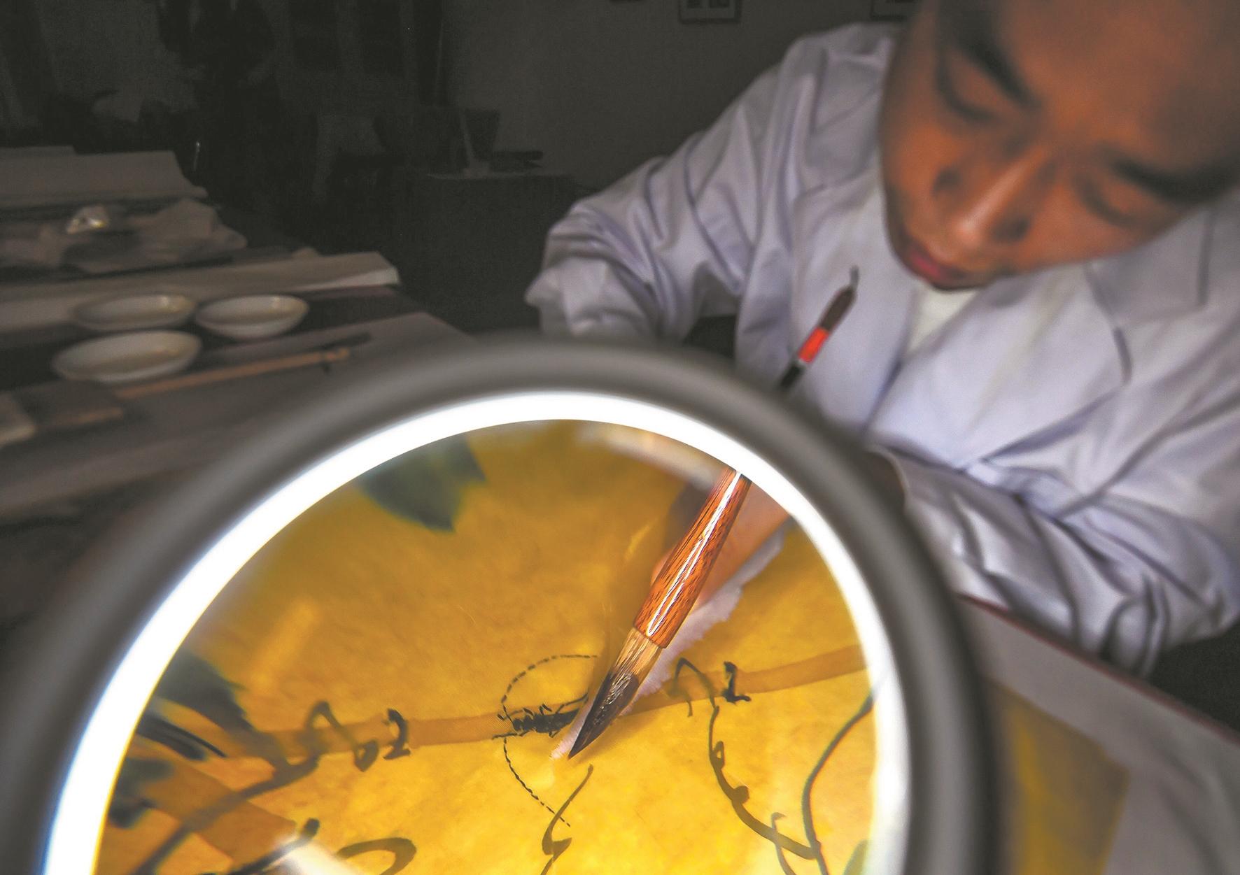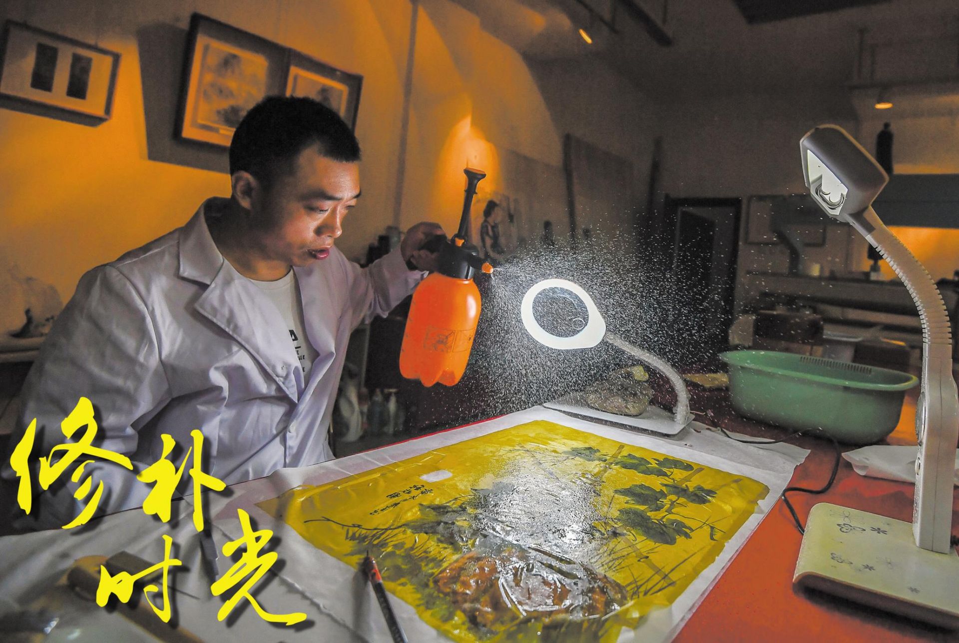“洗、揭、补、全”的修复环节看似简单,实际操作却往往要经历多次修补,才渐渐找回古画真容。工作台前,李广来正在“补”一幅破损的绢画,一手拿着细针,一手按着画面,在灯光下把断开的蟋蟀触须补好,挑、拉、按、揉,一起一落,残缺的触须渐渐完整灵动起来。