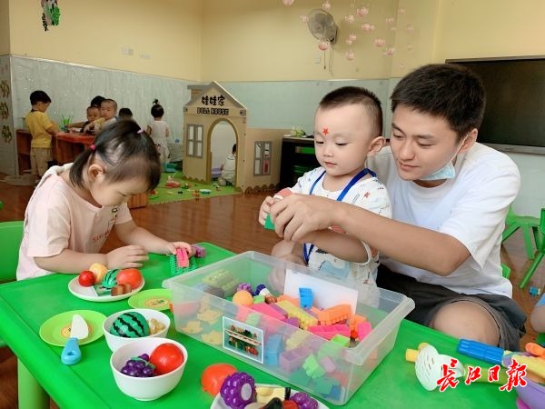 老师陪幼儿玩玩具,转移焦虑情绪。记者杨幸慈 摄