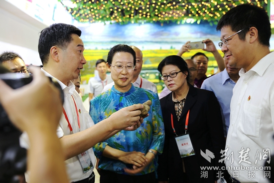 第二届“一节一会”上,黄冈市委副书记、市长邱丽新与嘉宾听取武穴佛手山药介绍。(通讯员供图)