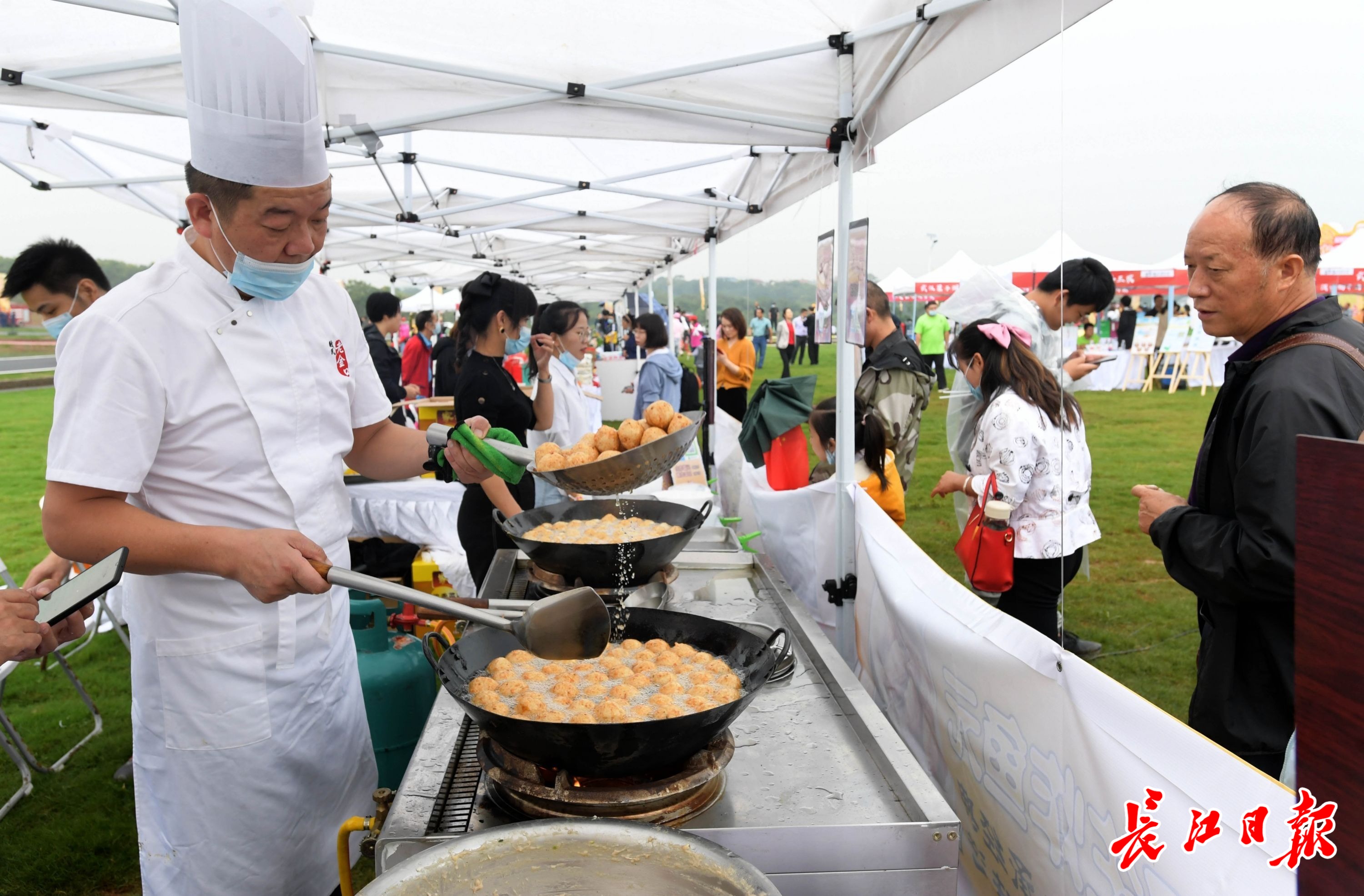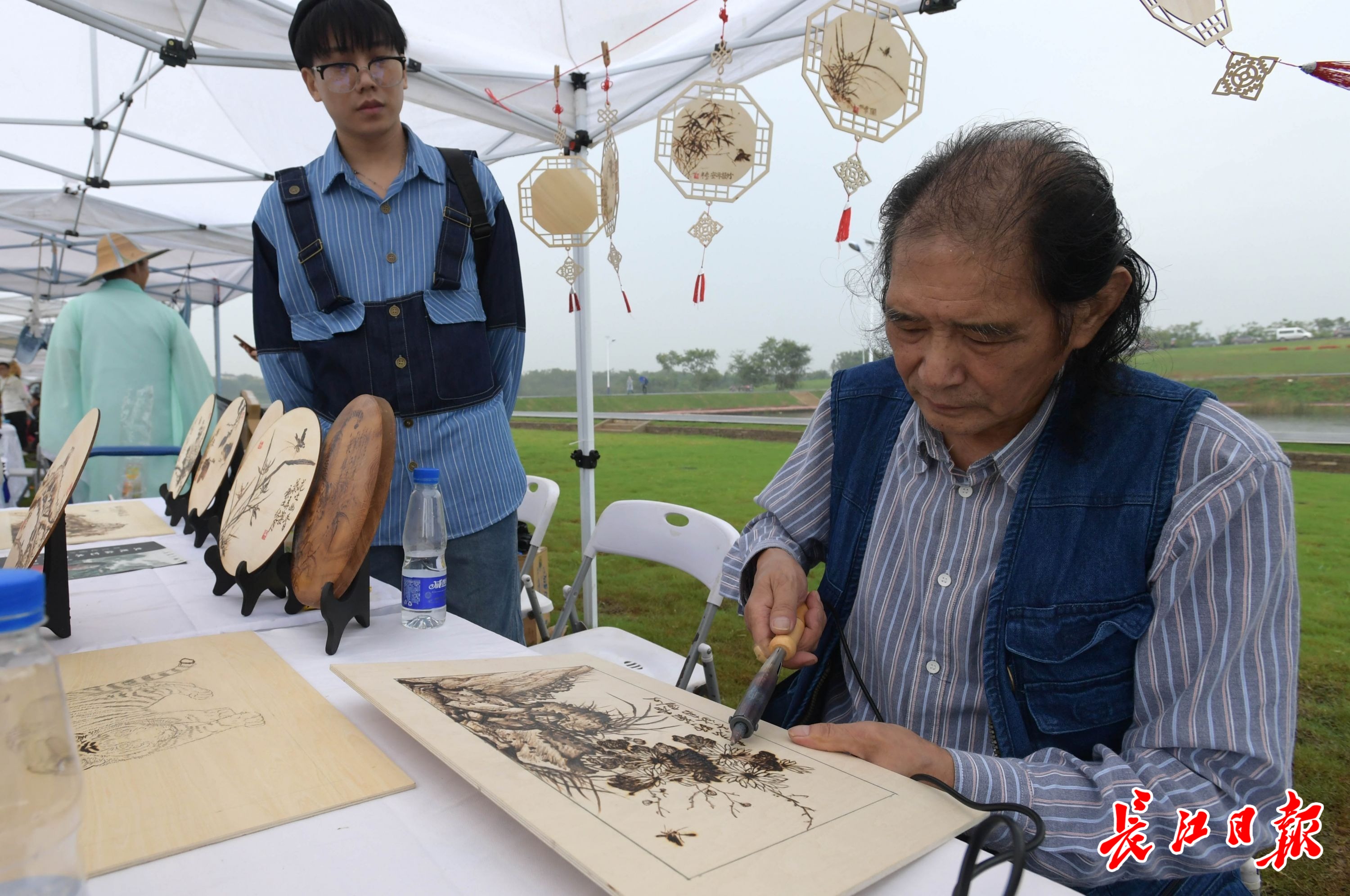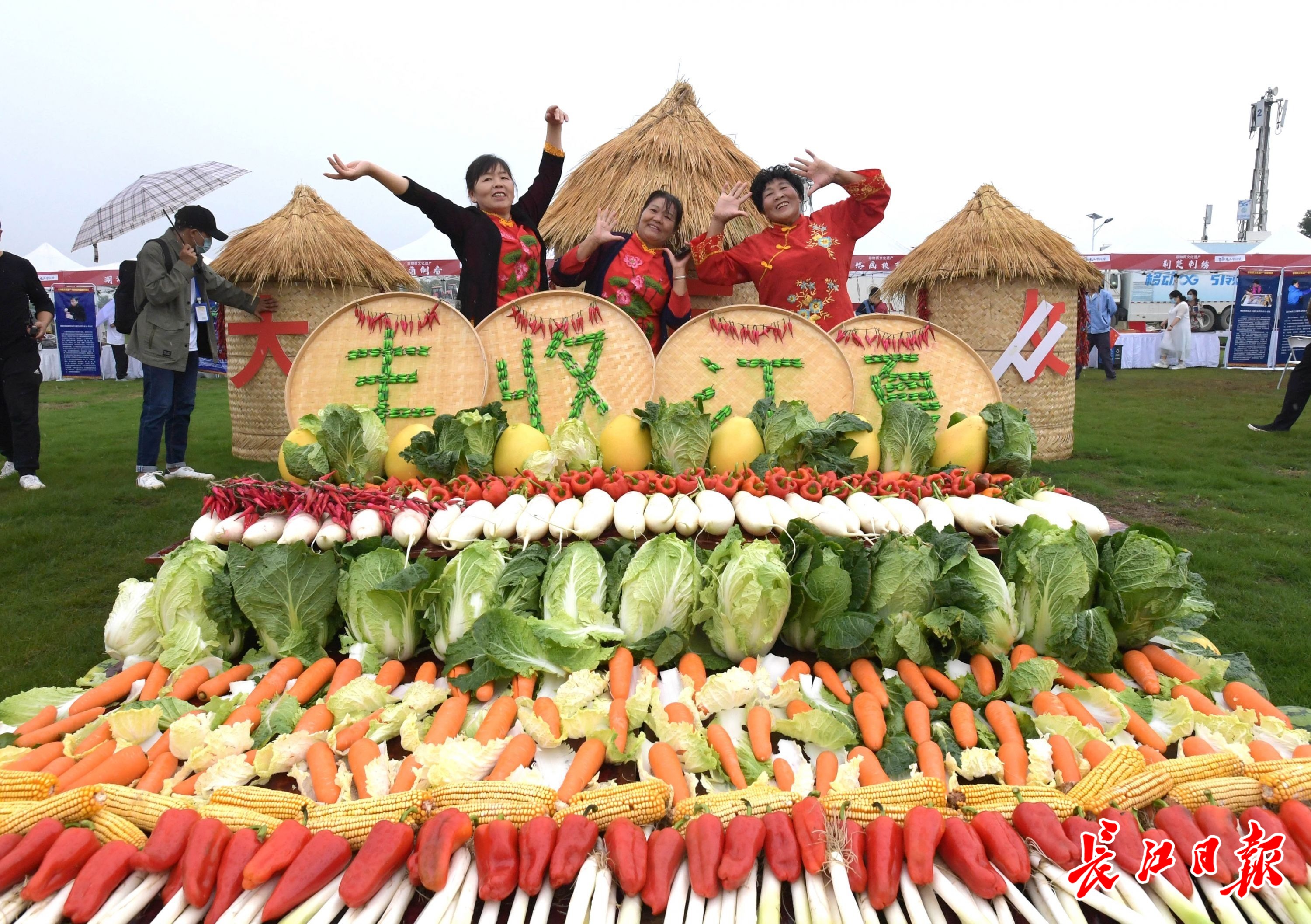 庆丰收活动现场,晒秋展出江夏特色农产品,丰收市集展示非物质文化遗产烙画艺术、柯进生态原浆酒、金口生炸丸子等制作技艺,农民运动会等项目吸引游人参与、拍照。现场为农民直播带货,助推特色产品。(记者刘斌 摄影报道)