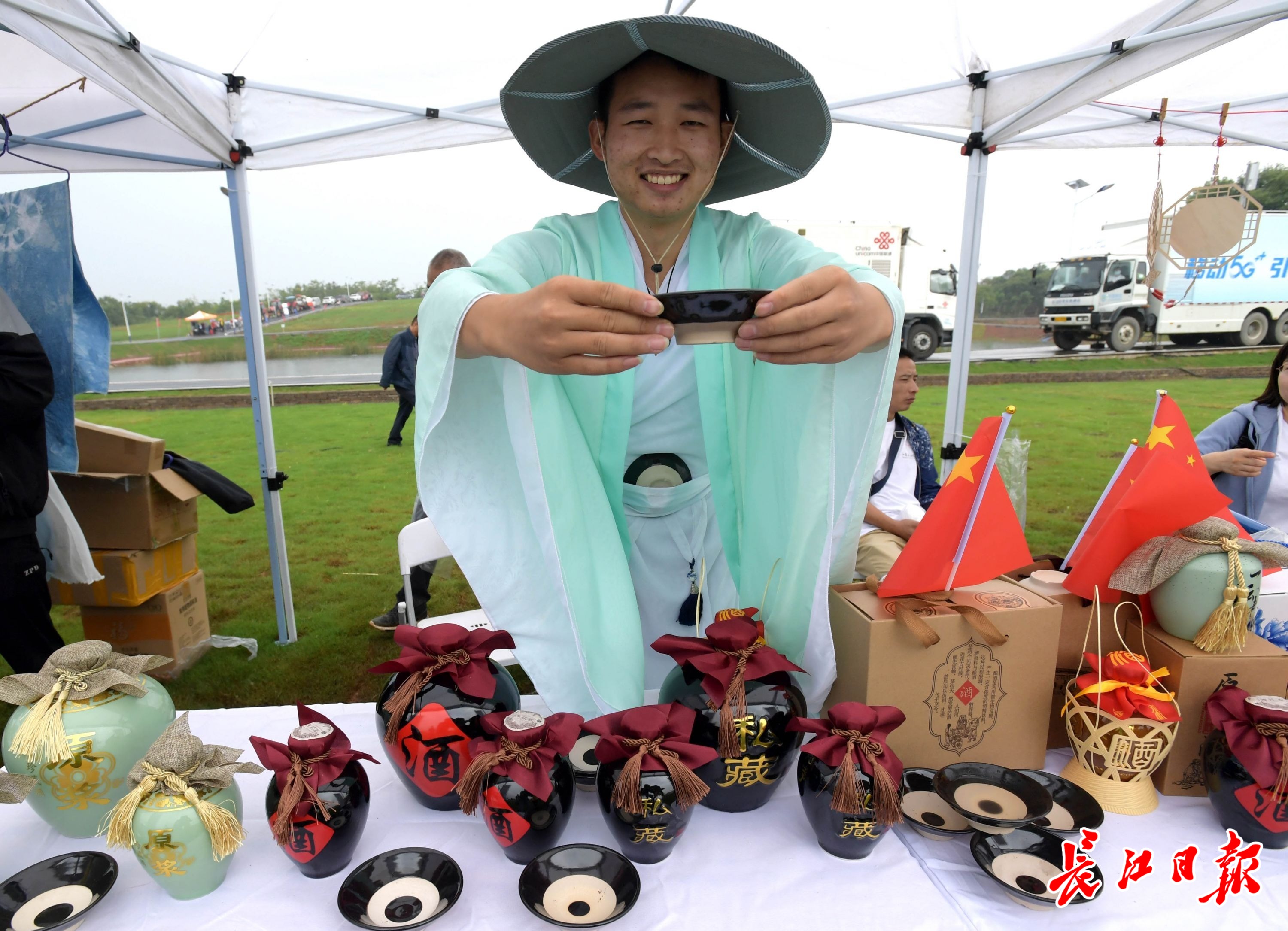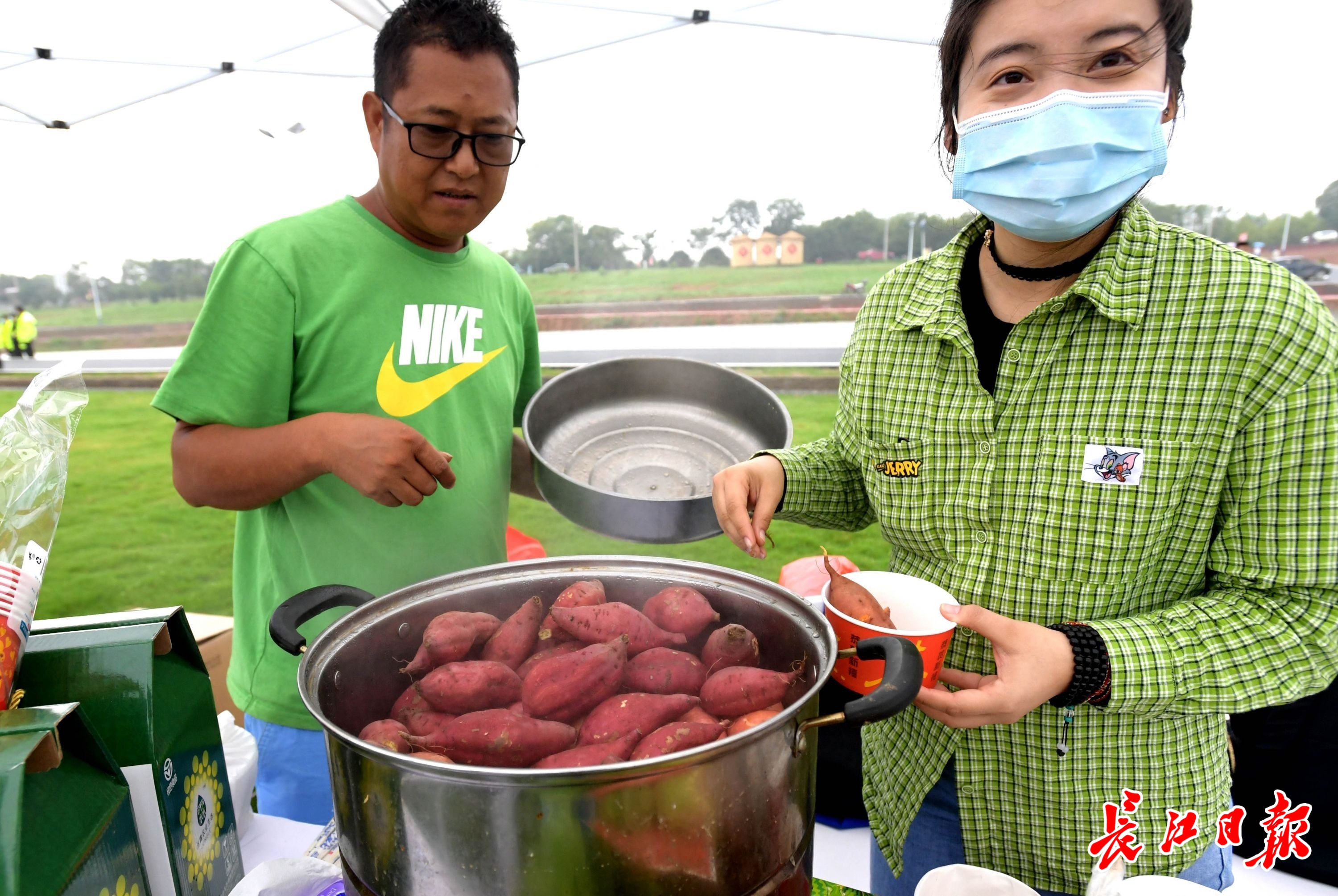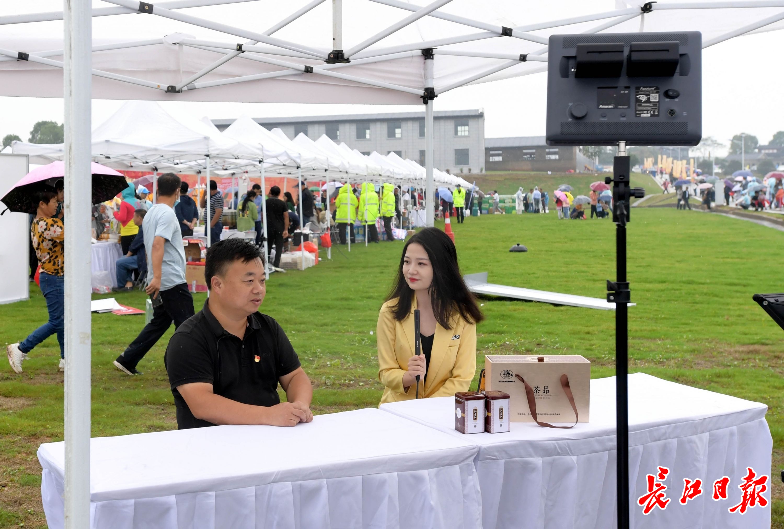 庆丰收活动现场,晒秋展出江夏特色农产品,丰收市集展示非物质文化遗产烙画艺术、柯进生态原浆酒、金口生炸丸子等制作技艺,农民运动会等项目吸引游人参与、拍照。现场为农民直播带货,助推特色产品。(记者刘斌 摄影报道)