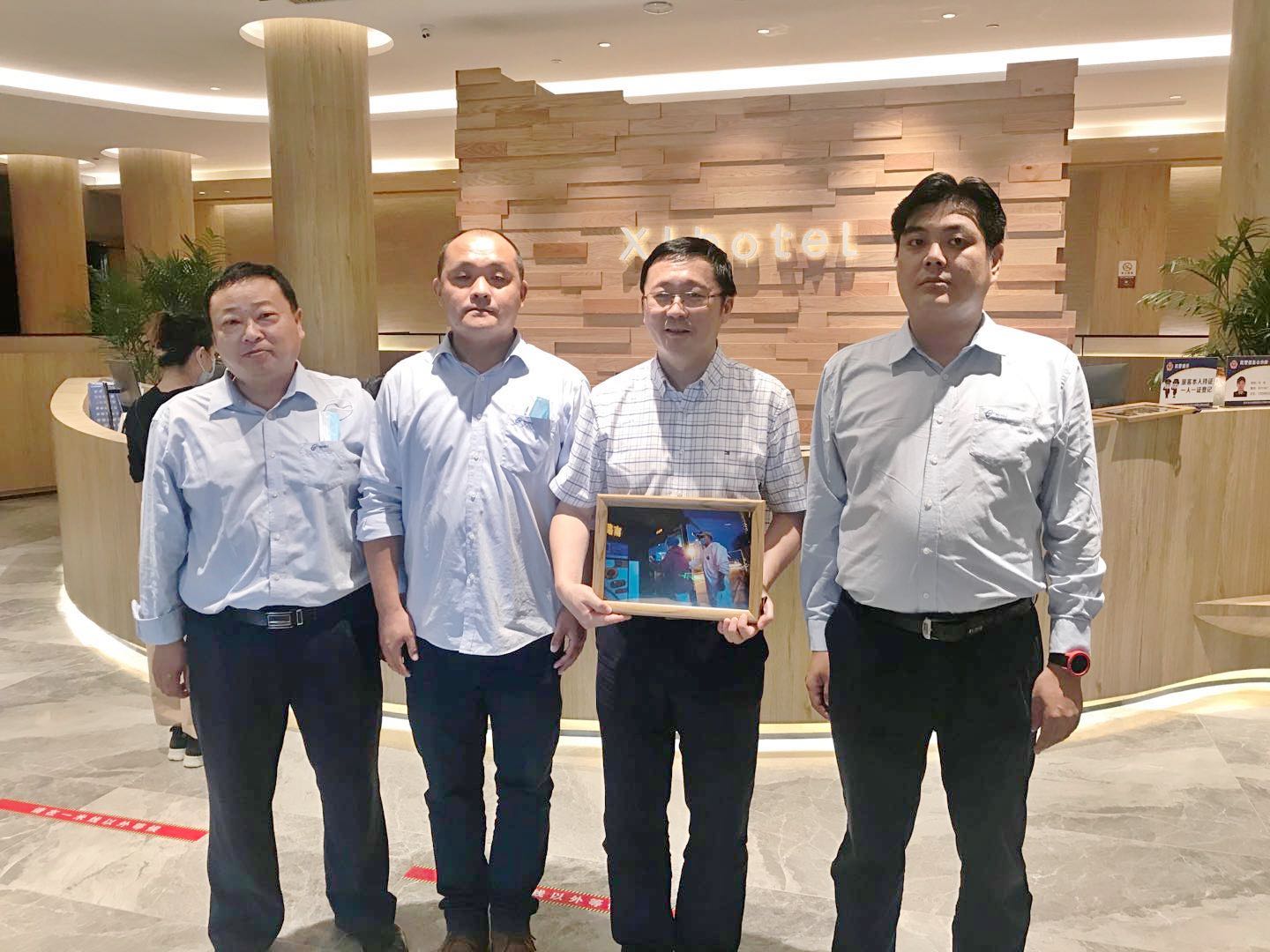 上海交大瑞金医院陈睦院长(右二)向“战友”3位公交车司机(左一汪琦、左二喻秋杰、右一王威)赠送“一张珍贵的照片”。通讯员陈祺民供图