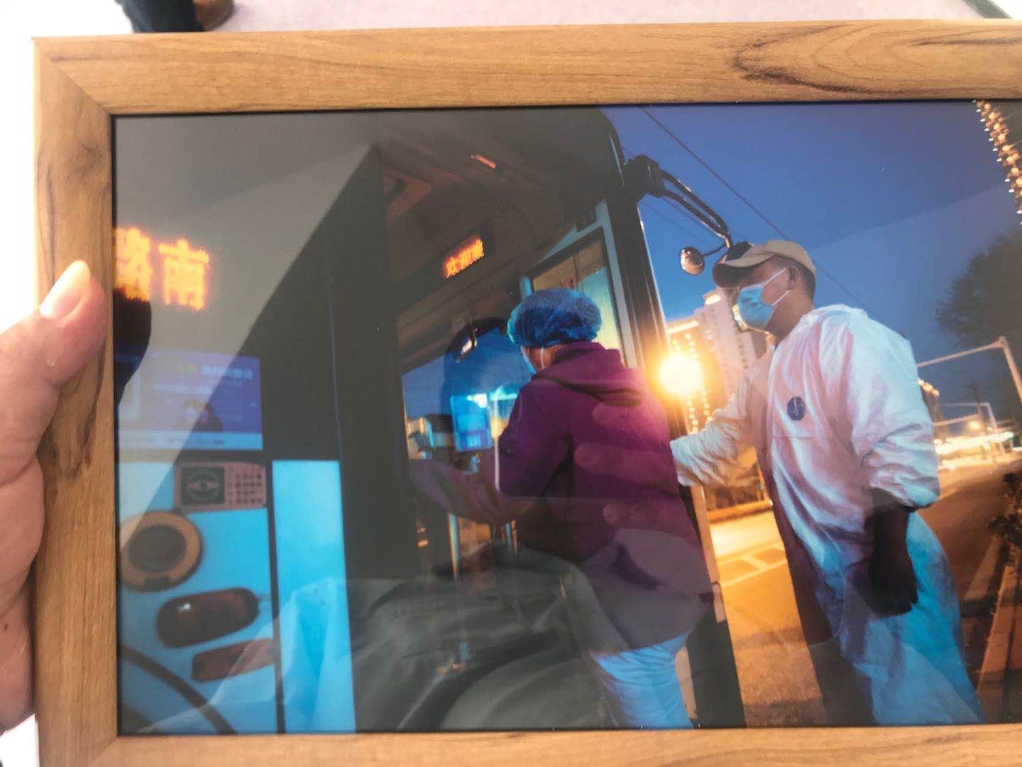上海医疗队拍下的战疫期间刚穿好防护服的公交师傅喻秋杰为大家服务的照片。通讯员陈祺民供图