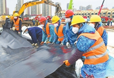 1月26日,火神山医院施工现场,施工工人正在平整的地面上铺设地膜和钢筋。