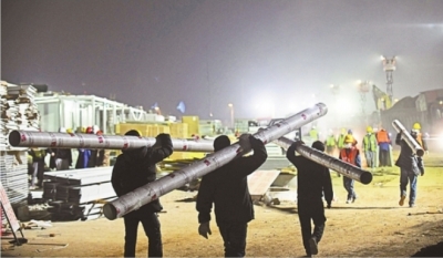 2月5日晚,武汉雷神山医院建设工地灯火通明,工人加紧完成装修收尾工作。