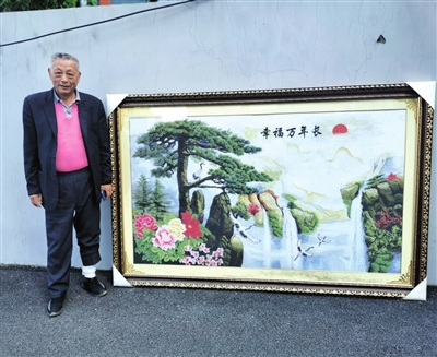 据金开珠介绍,这幅《幸福万年长》十字绣长达3米,高达2米,由老伴王晚珍手工绣制而成。本有一位老板想以15万元的价格收购,但因为自己和老伴的身体原因,十字绣花了三年多时间才绣好,老板等不了那么久另寻他人购买了,所以十字绣至今还没有卖出去。