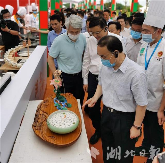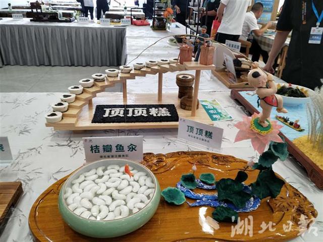 本次活动中,潜江服务区的烹饪大师精心选材,在烹饪中融合荆楚饮食文化。“桔瓣鱼汆”是将鱼肉做成鱼茸后,全凭厨师手感力度和技艺挤成桔瓣形状,成菜后,鱼汆形状像一瓣瓣剥开的桔肉。“顶顶糕”是在竹筒内加米粉、糖粉、桂花等蒸熟后,用道具顶岀,糕点成品形如蘑菇。