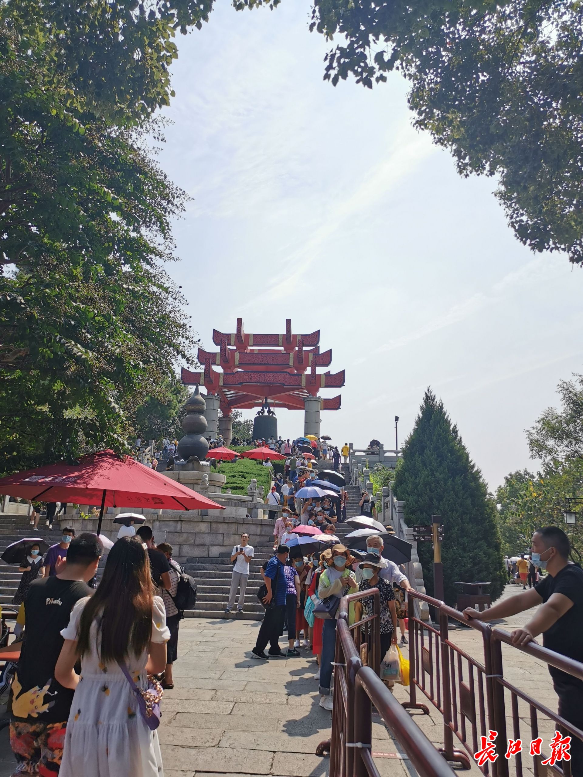 长江网记者在黄鹤楼公园走访发现,黄鹤楼主楼前排着近300米的长队,人数超过千人。在主楼入口处,有工作人员值守,游客依次沿着一个通道进入主楼。“排了40分钟才过来。”一名外地游客边擦汗边答复记者。