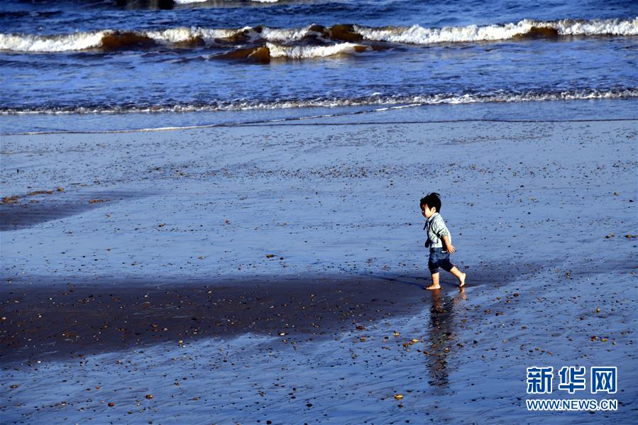 9月26日,一名小朋友在日照市山海天旅游度假区海滨玩耍。 当日,山东日照市天气晴好,阳光明媚,不少市民和游客来到海边游玩。 新华社记者 范长国 摄