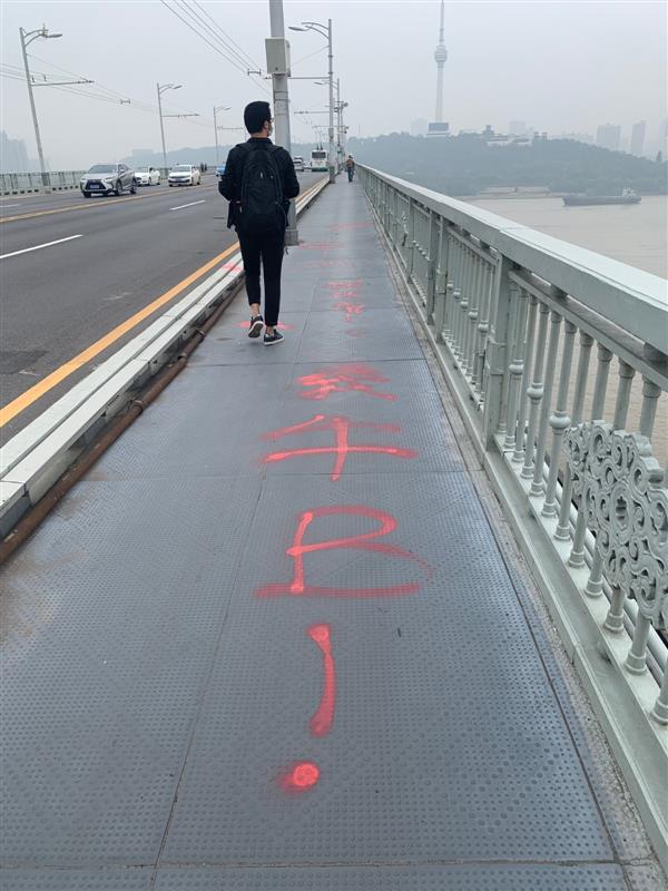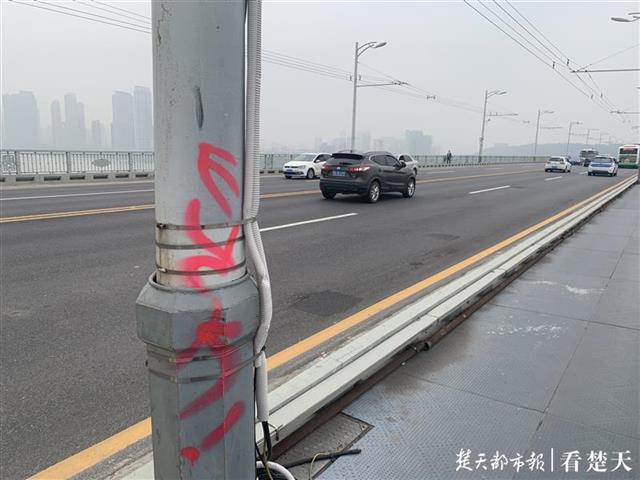 高先生介绍,26日上午他从武昌桥头走上武汉长江大桥游玩,沿着东侧的人行道快走到桥中间时,看到人行道路面、旁边的灯杆和部分护栏被人用红漆油漆涂鸦,写着“走好脚下的路”等汉字,以及一些不文明的英文单词。“谁那么无聊?跑到这里来涂鸦,还涂鸦得那么难看。”高先生说,看到武汉长江大桥被人画成了大花脸,他很气愤,并发微博曝光这一行为,呼吁到家爱护长江大桥,爱护桥上的环境。