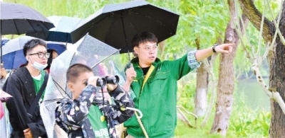 武汉动物园“明星饲养员”杨毅(右一)为小学员上课,讲解湿地与鸟,带领大家亲近自然,在户外观察动物与鸟的生活习性。