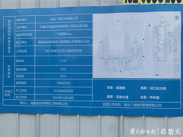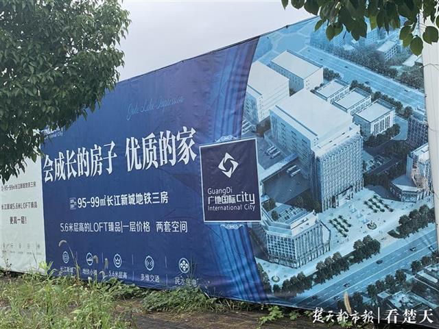 9月20日,楚天都市报记者来到黄陂汉口北大道武湖正街,广地国际city楼盘工地被围墙围起来,工地内杂草丛生,一片荒凉。张贴在围墙上的宣传语写着:长江新城地铁三房,5.6米层高的LOFT臻品,一层价格两套空间。在项目公示牌上,建设单位为武汉兴业广地农业有限公司,建筑面积79500平方米,开工时间2019年9月26日,竣工时间2020年12月30日。