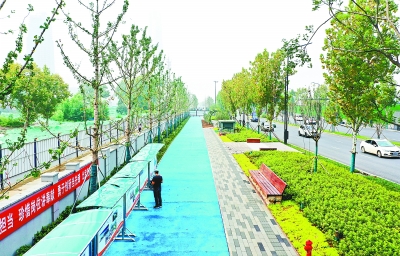27日上午,记者来到首开段,远远只见沿右岸大道有一条靓丽“绿道”和一条灰色人行道,十分显眼。设计方中南建筑设计院景观生态环境中心总景观师庄苇介绍:“设计的这套慢行系统由两条不同功能的步道组成,4米宽绿道和2米宽人行道贯穿全线,绿道上可以骑自行车,也可以步行。”