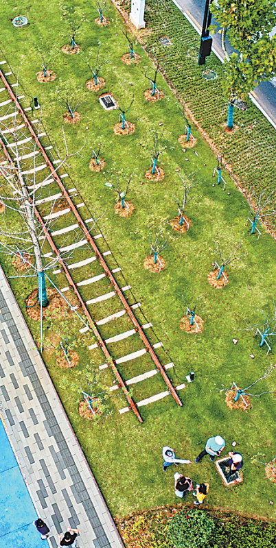 园林绿化也是武昌生态文化长廊的一大特色。记者在首开段看到,绿道靠内一侧种植着一排银杏,每棵树几乎差不多高,笔直挺拔。“我们统一挑选的是胸径25厘米、高度10米左右的银杏树。”绿化施工方苏州园林项目负责人介绍,银杏也被称为地球“活化石”和植物界“大熊猫”,可融入其古韵久深、自强不息、蓬勃发展的“百年精神”。