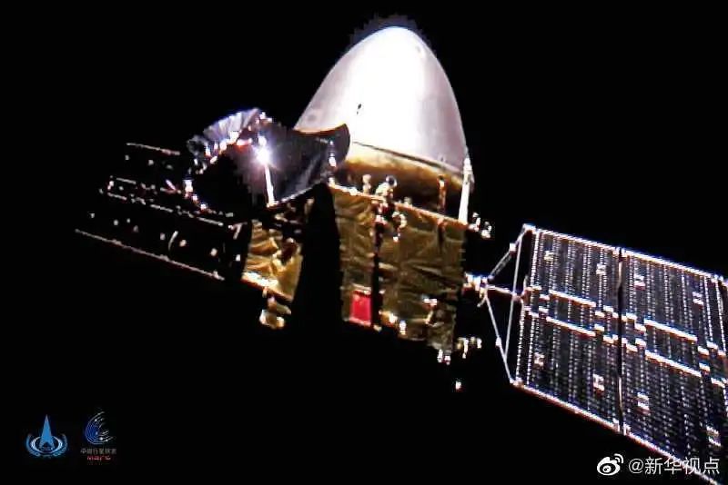 这是“天问一号”探测器首次深空“自拍”,茫茫宇宙中银色的着陆巡视器和金色的环绕器熠熠生辉,“天问一号”以此向祖国报告平安,表达生日祝福。
