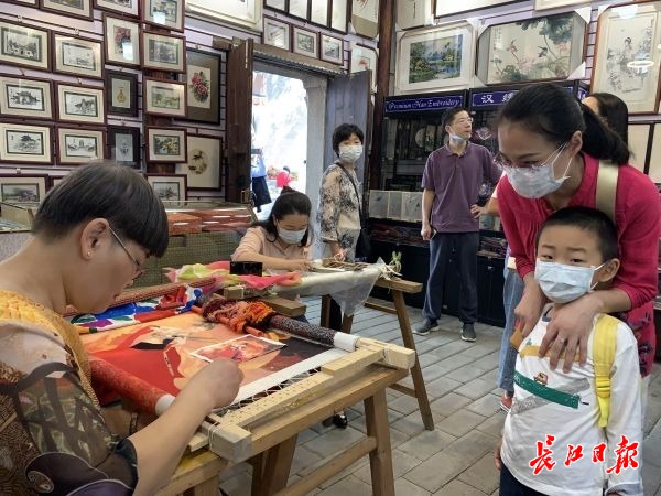 “汉绣源于战国时期的楚地刺绣,是具有湖北特色的古老绣种。汉绣以楚绣为基础,融汇南北诸家绣法之长,其针法运用和变换在绣业中独树一帜。”在肖兰刺绣馆,湖北省工艺美术大师、武汉好手艺民间工艺技能传承大师肖兰正热情向进店的游客推介汉绣艺术。在武大樱花饼手工店,前来挑选、购买产品的市民、游客络绎不绝。该店现场负责人介绍,国庆、中秋假日期间,进店消费的顾客可以享受“买五送一”的优惠活动,满足顾客多样化消费需求。