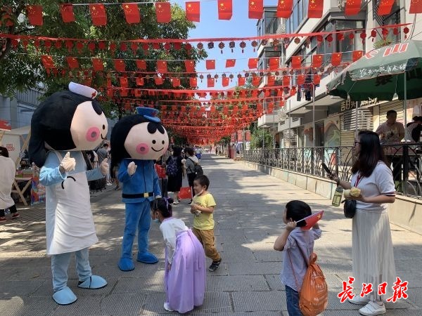 假日期间,昙华林国庆市集同步举办。文华书城醉石斋篆刻、金芝绣品阁、莉莉周·东棠、卡酷乐器等60多家文创类商户沿街摆摊,现场进行楚凤汉绣、布艺堆绣、楚陶制作技艺等非遗展示,以及文创产品、伴手礼展销,提振假日消费,助力疫后重振。楚凤汉绣传承人、湖北省汉绣协会会长陈慧指导市民、游客绣五星红旗,庆祝新中国71岁华诞,祝福伟大祖国繁荣昌盛。百年老字号“老谦记豆丝”不仅带来了包装好的干豆丝,厨师把灶台都搬到了街区市集,现场制作湿豆丝,展示传统豆丝加工工艺,引来不少人围观、下单。