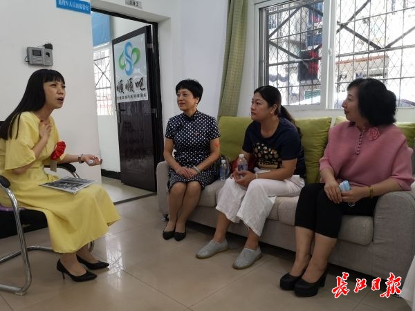 倪萍(左一)正在为孙英(右二)介绍社区的情况。记者覃柳玮 摄
