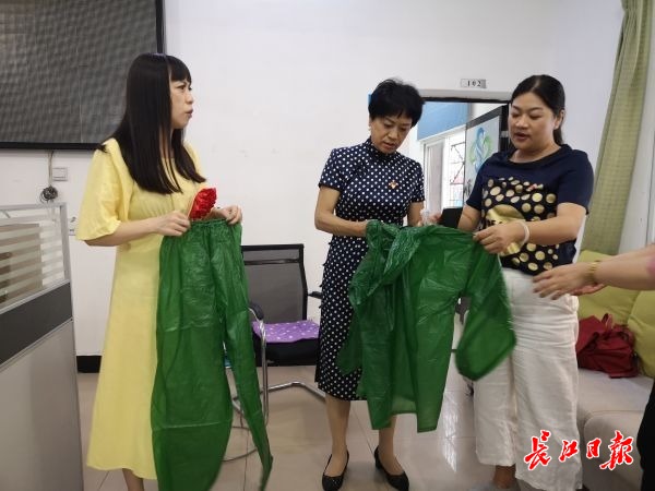 倪萍(左一)正在展示疫情防控期间收到的雨衣。记者覃柳玮 摄