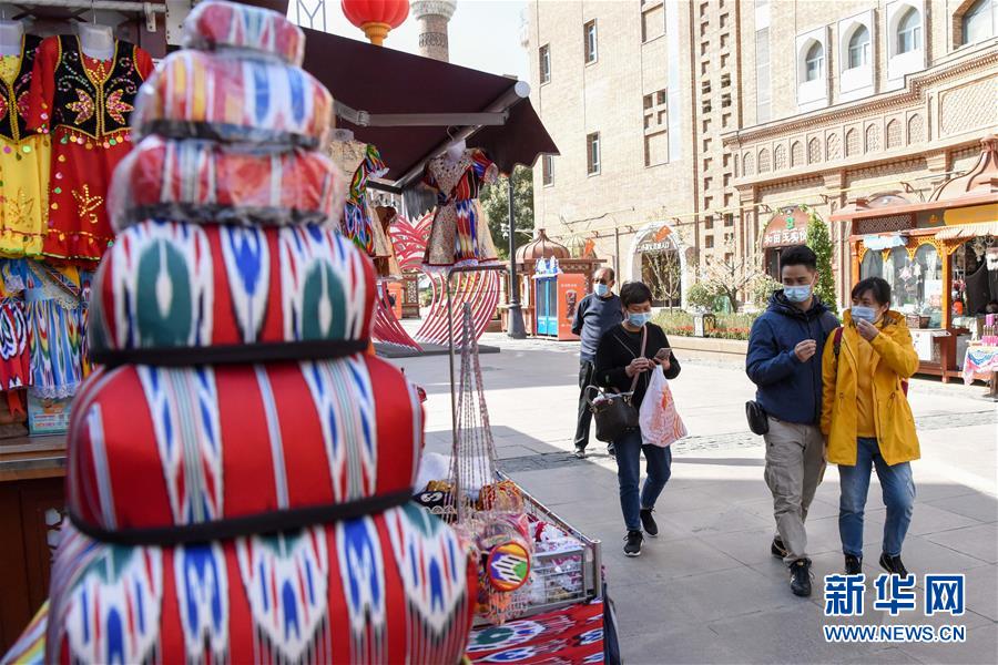 10月4日,游客在乌鲁木齐大巴扎景区观光游览。 中秋和国庆长假期间,新疆乌鲁木齐市大巴扎景区吸引不少游客前来游览、购物、品味美食,享受假期休闲时光。 新华社记者 丁磊 摄