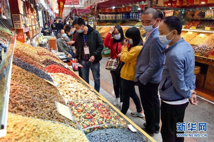 10月4日,游客在乌鲁木齐大巴扎景区挑选干果。 中秋和国庆长假期间,新疆乌鲁木齐市大巴扎景区吸引不少游客前来游览、购物、品味美食,享受假期休闲时光。 新华社记者 丁磊 摄