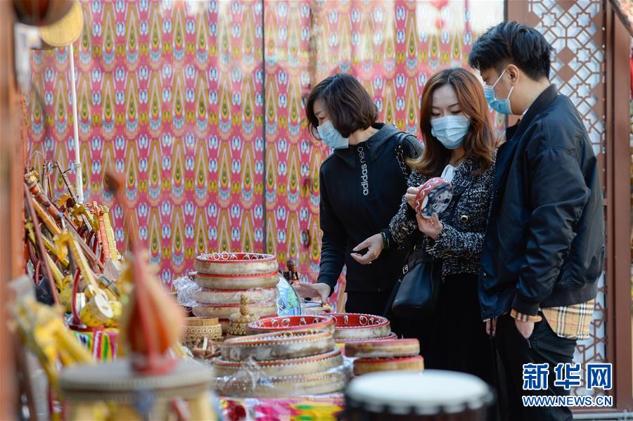 10月4日,游客在乌鲁木齐大巴扎景区挑选手鼓。 中秋和国庆长假期间,新疆乌鲁木齐市大巴扎景区吸引不少游客前来游览、购物、品味美食,享受假期休闲时光。 新华社记者 丁磊 摄