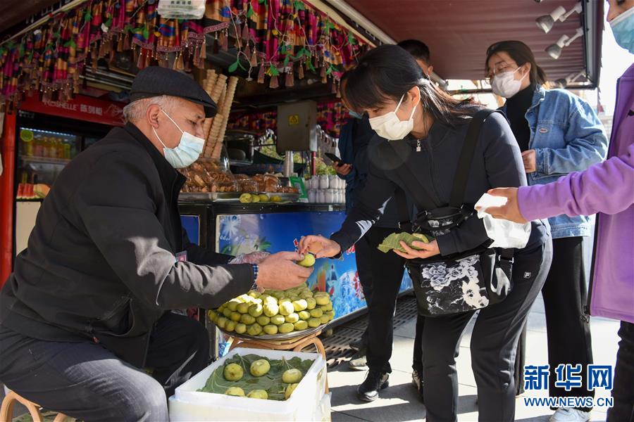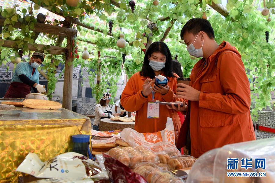 10月4日,游客在乌鲁木齐大巴扎景区购买馕产品。 中秋和国庆长假期间,新疆乌鲁木齐市大巴扎景区吸引不少游客前来游览、购物、品味美食,享受假期休闲时光。 新华社记者 丁磊 摄