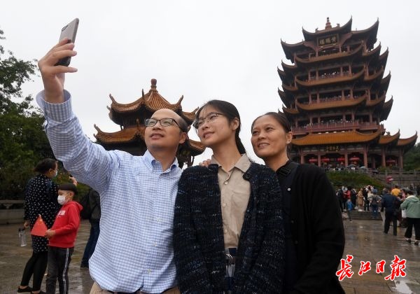 长江网10月4日讯(见习记者谭芳)黄建芳来到了武汉,这位曾驰援雷神山医院的上海医生,这次的身份是一名游客。10月3日上午,她与丈夫陈前带着女儿陈石聪冒雨登上了黄鹤楼。