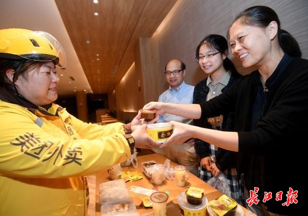 美团武昌火车站女站长刘俊平给黄建芳医生一家送来蔡林记的早点。记者史伟 摄