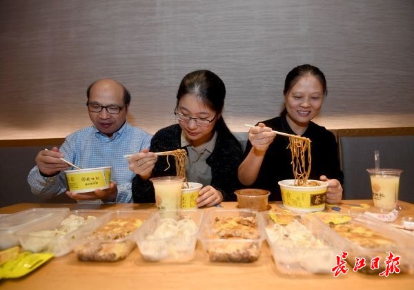 黄建芳一家人在品尝武汉特色早餐。记者史伟 摄