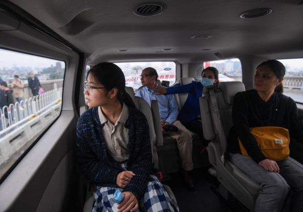 黄建芳一家人乘车通过武汉长江大桥。记者史伟 摄