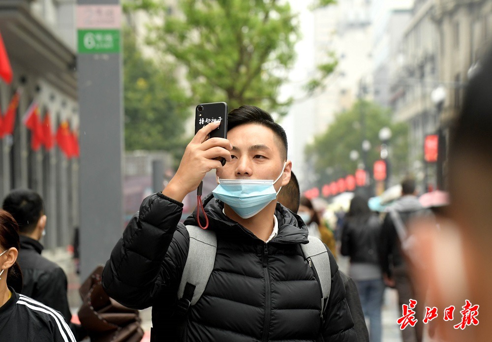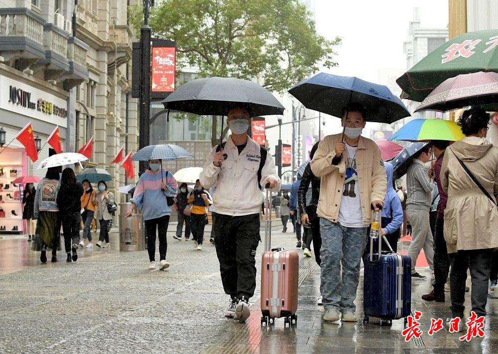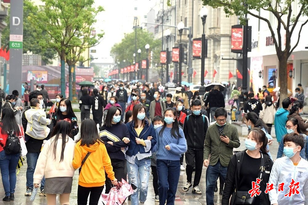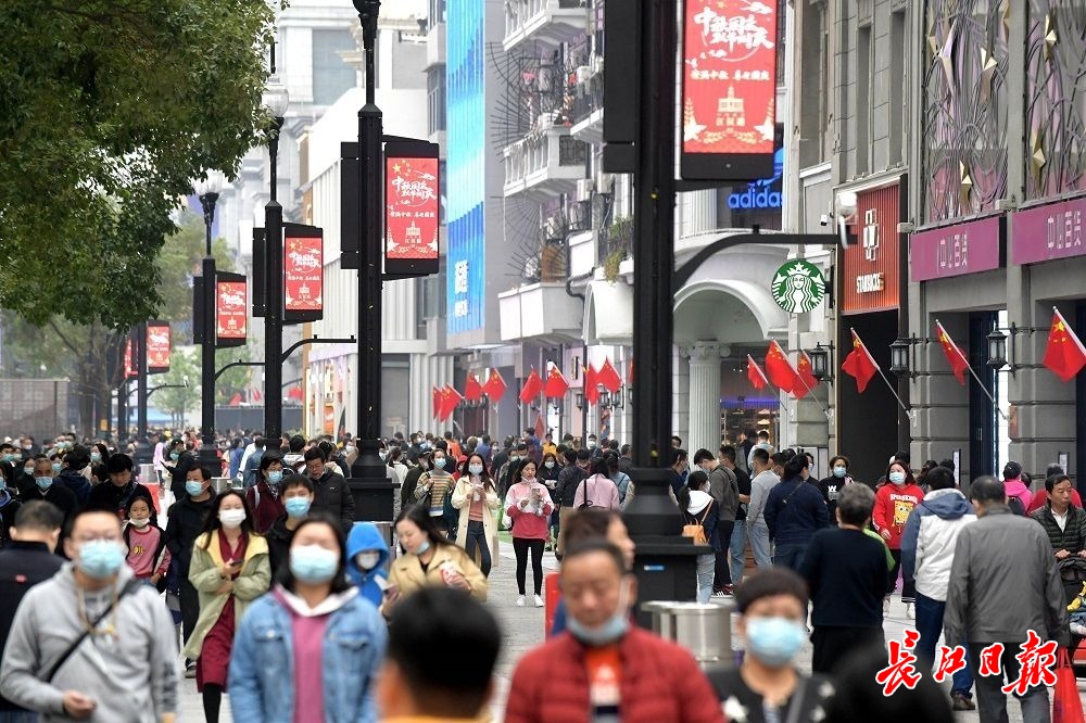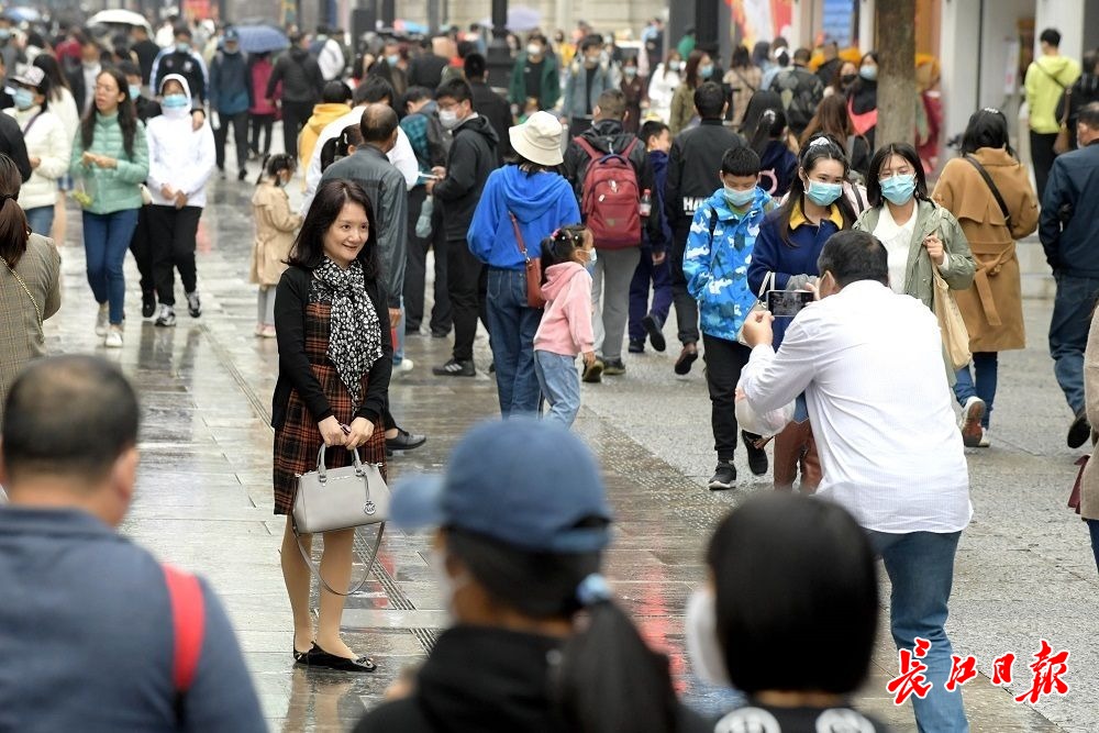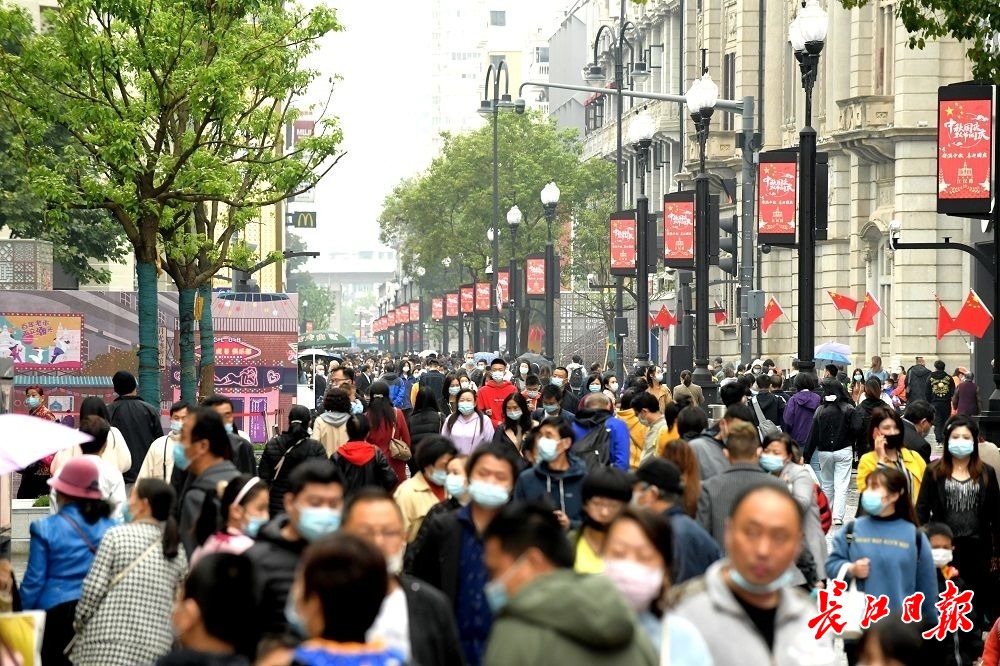 长江网10月6日讯10月6日,国庆假期第六天,武汉阴天有小雨,江汉路步行街人头攒动、游人如织,不少外地游客拖着旅行箱来此打卡,购物、品尝美食、拍照、逛街,武汉江汉路步行街俨然成为游人欢乐的海洋。(记者刘斌 摄影报道)