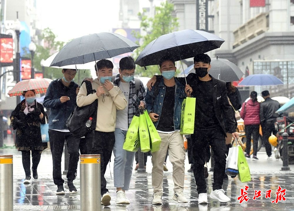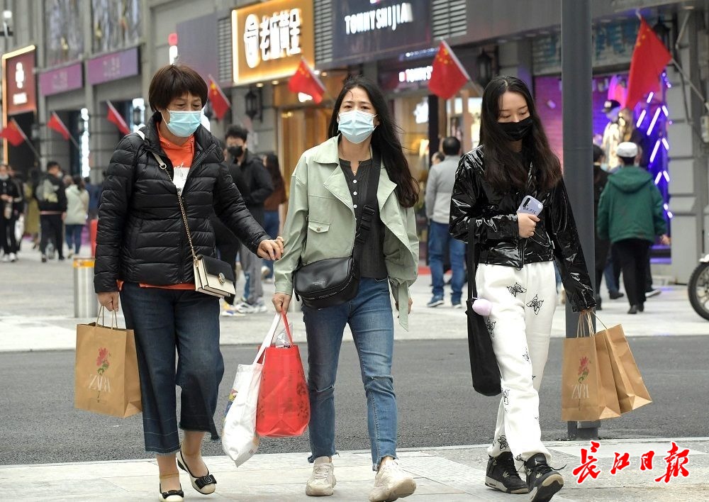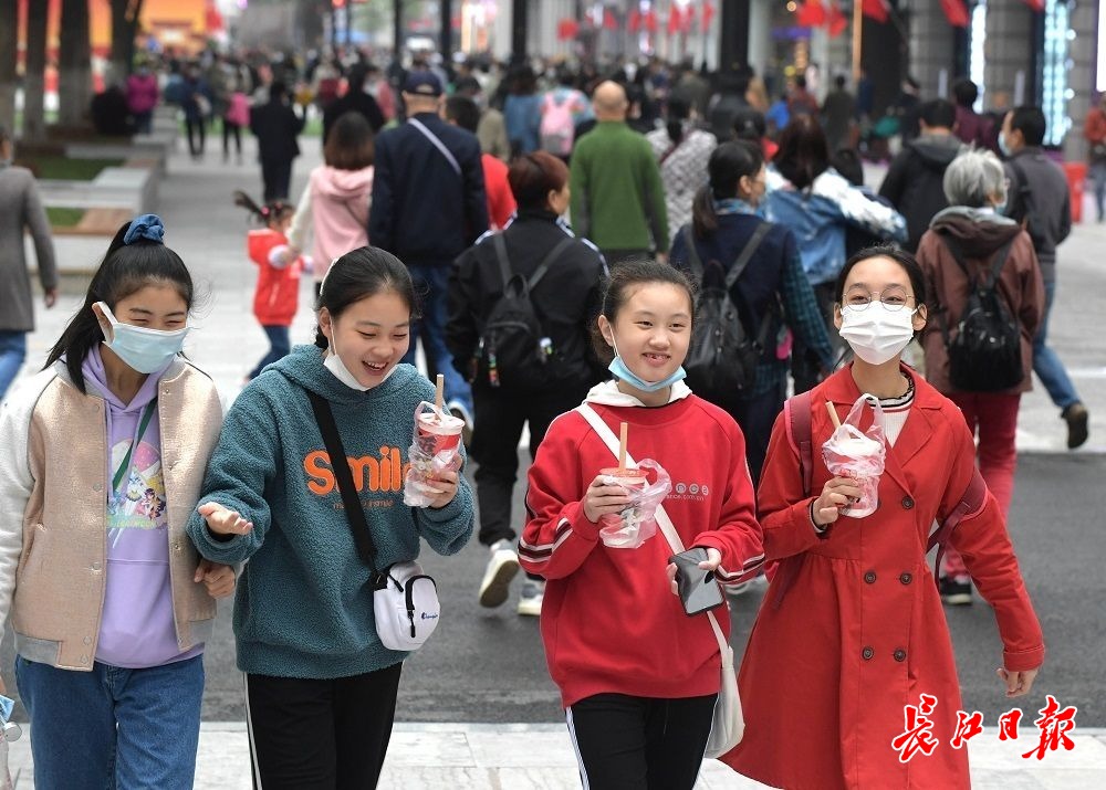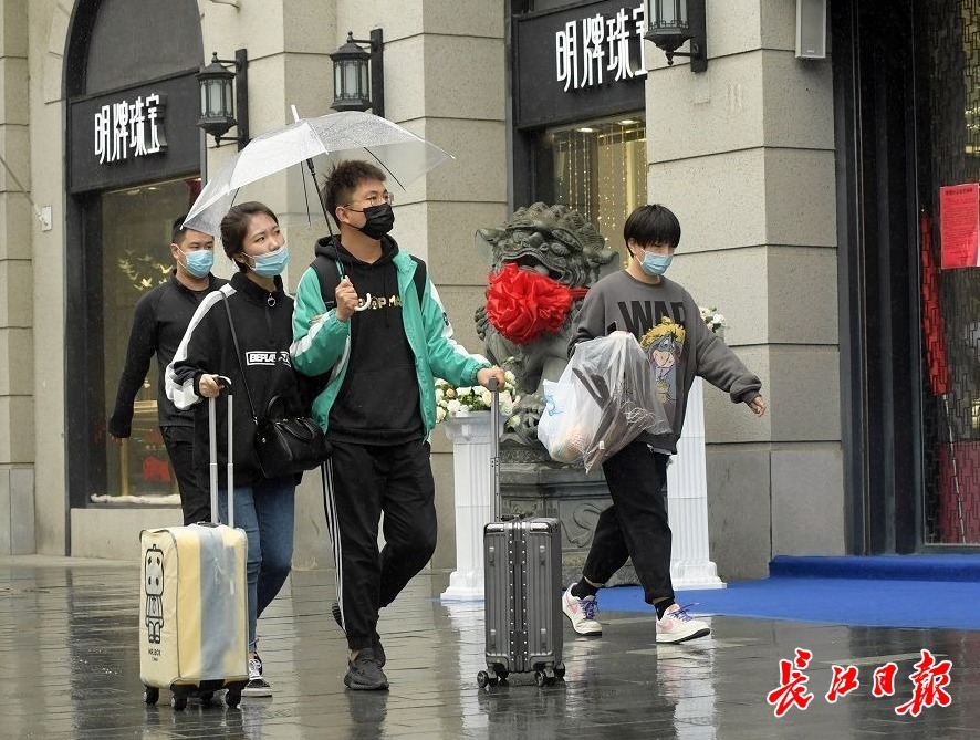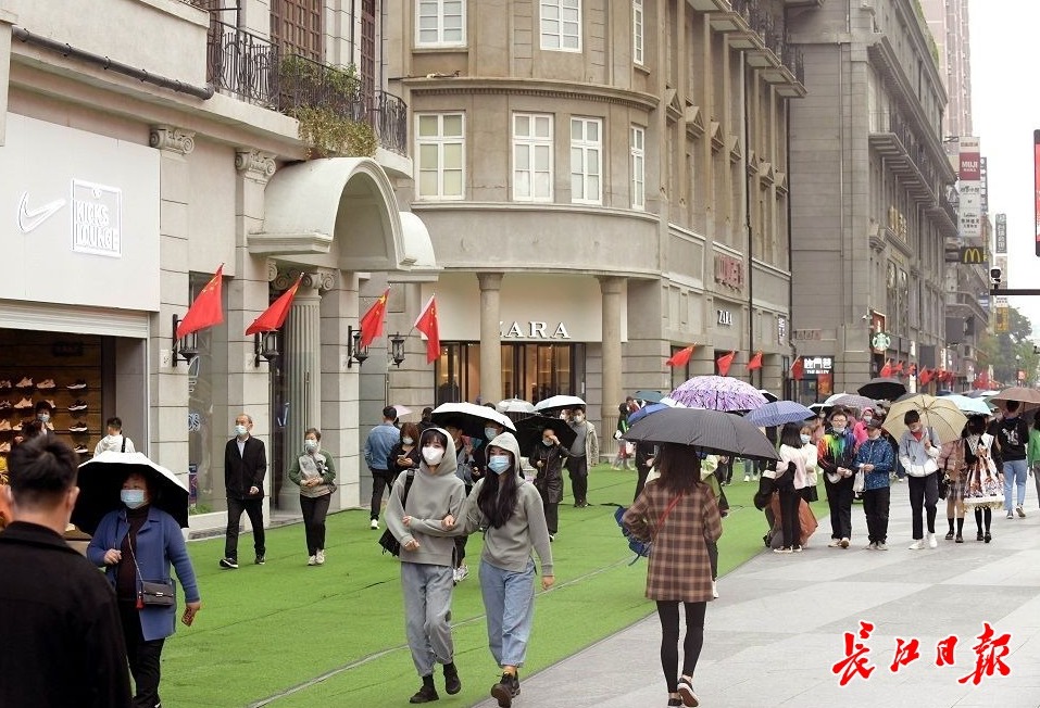 长江网10月6日讯10月6日,国庆假期第六天,武汉阴天有小雨,江汉路步行街人头攒动、游人如织,不少外地游客拖着旅行箱来此打卡,购物、品尝美食、拍照、逛街,武汉江汉路步行街俨然成为游人欢乐的海洋。(记者刘斌 摄影报道)