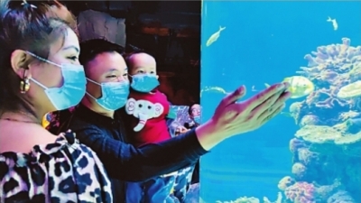 亲子家庭畅游东湖海洋世界。