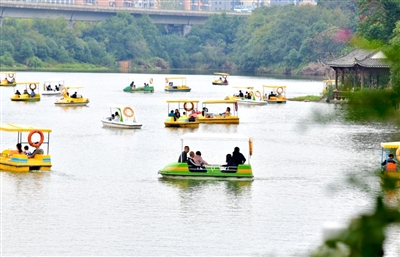图③:十六潭公园,游客泛舟湖上,享受美景。