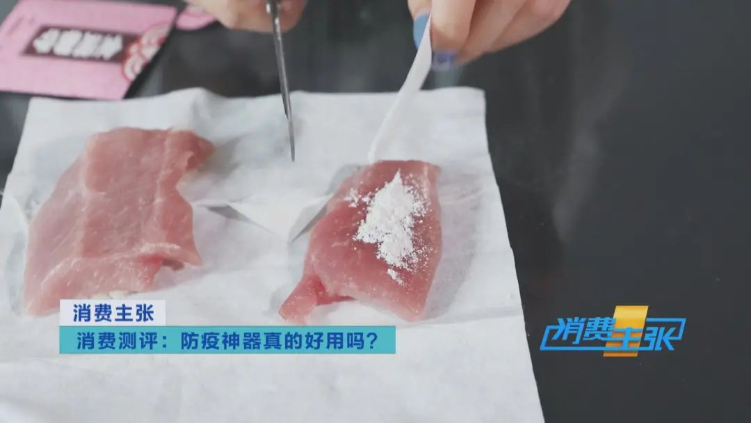 把消毒卡里的物质取出来,放在一块生肉上,2-3分钟后把粉末用水冲掉。这时发现,生肉上面已经有了被灼伤的痕迹。如果是小孩子随身佩戴,出了汗或者赶上下雨天,消毒卡进了水,直接接触到皮肤,就存在被灼伤的危险。