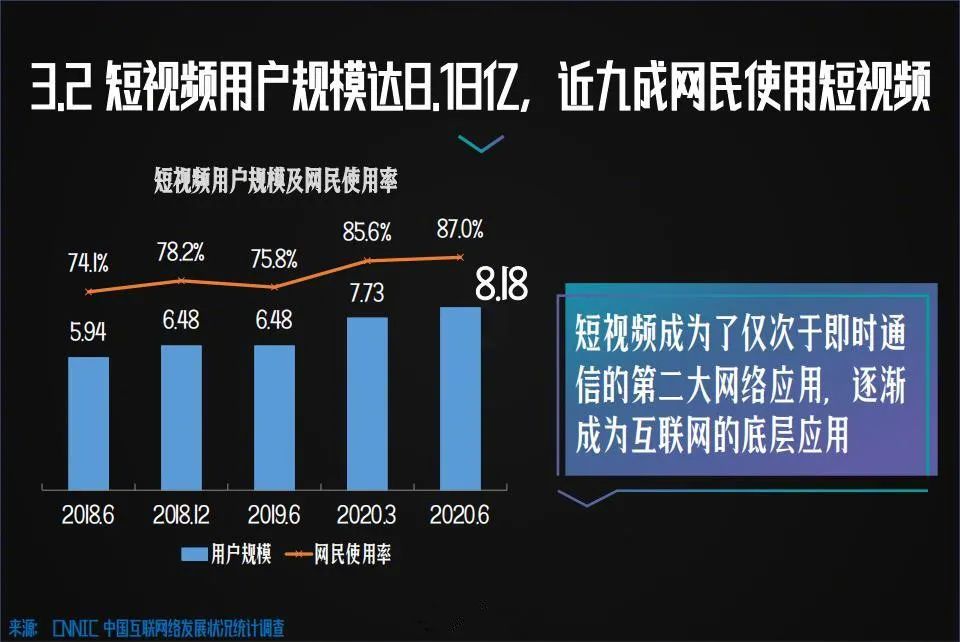 日前发布的《2020中国网络视听发展研究报告》显示,截至2020年6月,我国网络视听用户规模达9.01亿;短视频已成为用户“杀”时间的利器,以人均单日110分钟的使用时长超越了即时通讯。