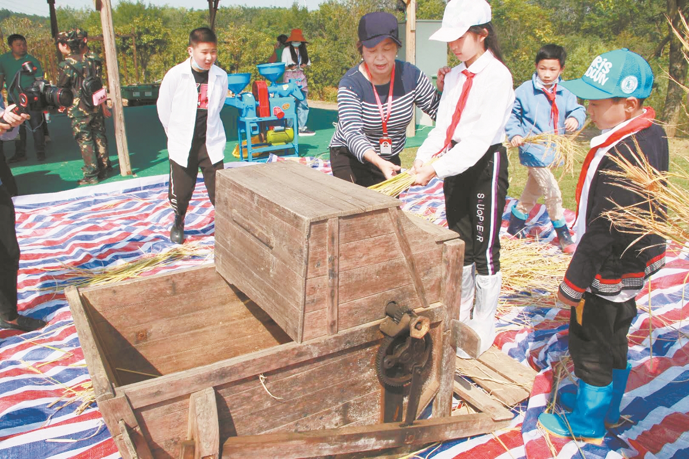 收割后的稻子,还要进行脱粒、筛杂、碾米,经过各种烹饪程序,才能被端上餐桌。在老师的指导下,孩子们用传统的打谷机和连枷,体验了稻子脱粒的过程,从中感受到了一粥一饭的来之不易。