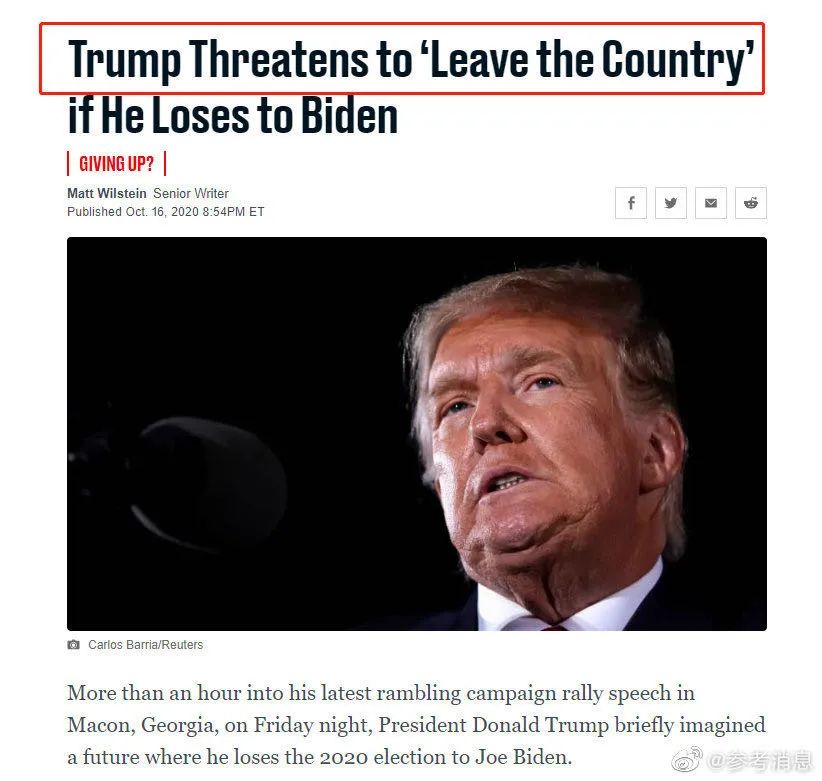 据美国“野兽日报”网站报道,美国总统特朗普扬言如果他在大选中输给拜登,他可能会“离开美国”。