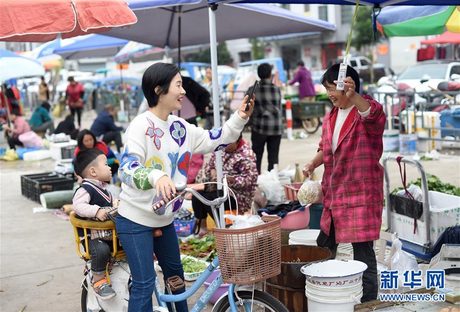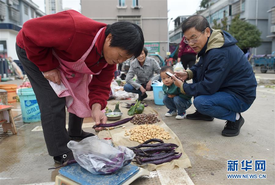 10月17日,诸暨市民在新安佳园农产品自产自销点买菜时扫码付款。 今年6月起,浙江省诸暨市综合行政执法局在城区选址增设新安佳园等3处农产品自产自销点,并由执法队员和城管志愿者进行规范管理,满足周边农户农产品销售需求的同时消除占道经营隐患。 新华社记者 韩传号 摄
