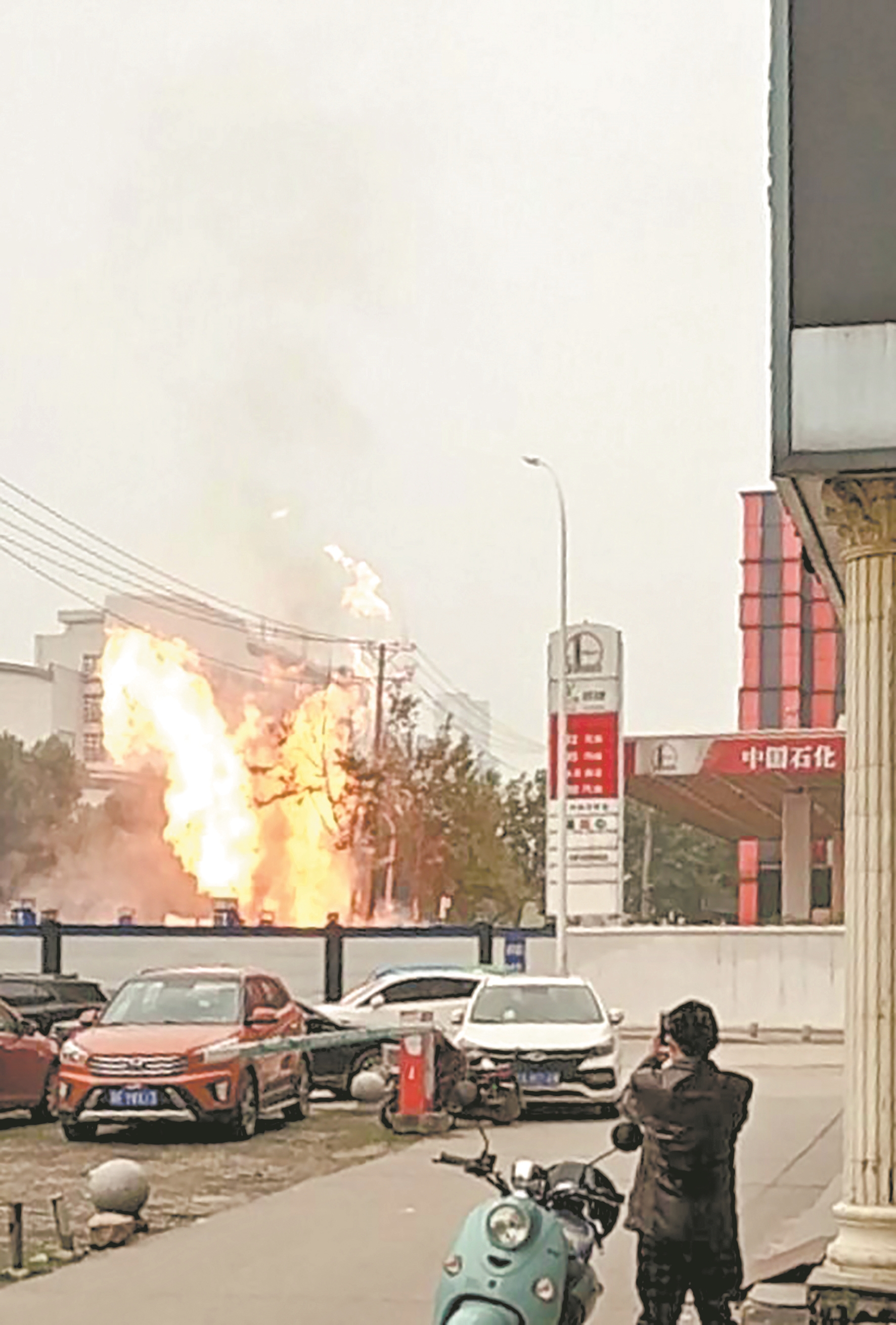 大约10分钟后,泄漏的天然气突然起火燃烧,并发出三声巨大的爆鸣声。燃烧的火焰将工地上方的高压线和作业的挖机引燃,燃烧产生的高温将5米开外的加油站多台加油机械设备、标牌设施烘烤变形。