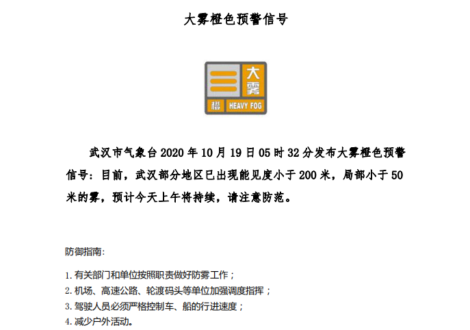 长江网10月19日讯(记者龚萍)武汉市发布入秋以来首个大雾橙色预警,今天早上5时32分,武汉市气象台发布大雾橙色预警信号:目前,武汉部分地区已经出现能见度小于200米,局部小于50米的雾,预计今天上午将持续,请注意防范。