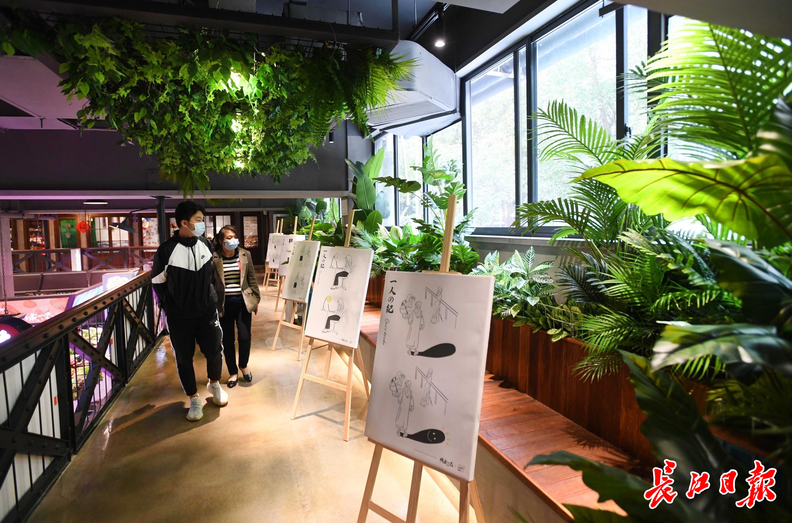 沙湖边市集绿植环绕的二楼文化长廊漫画展。记者高勇 摄