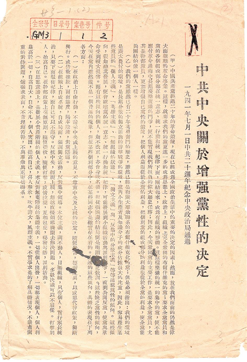 1941年12月19日陈少敏同志《关于“加强党性”的报告》。