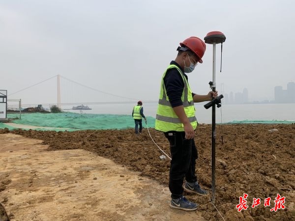 施工员毛双双正测量滩地高程。记者王怡人 摄