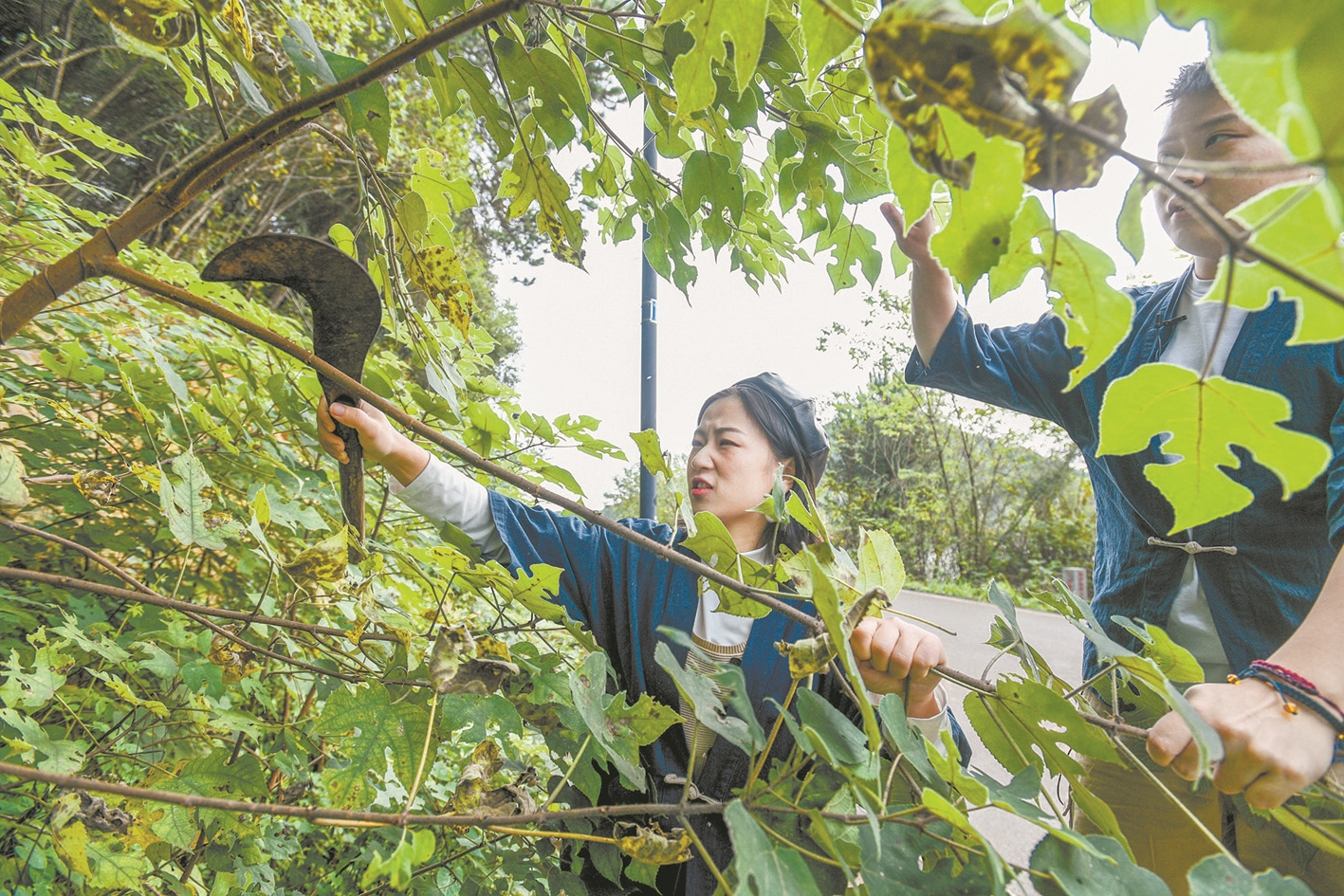 21日,在青龙山脚下,24岁的“字言纸语”非遗馆馆长杨鹏带着记者上山采集随处可见的构树皮,这种树易繁殖,材质洁白,其韧皮纤维是造纸的高级原料。